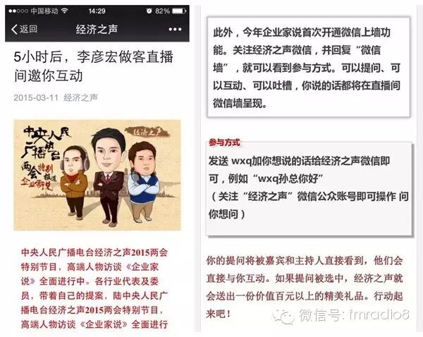 在如今这个移动互联网时代,互动显得尤为重要。中央人民广播电台经济之声两会特别访谈《企业家说》,利用传统媒体与新媒体结合,在两会报道过程中,在直播间设立“微信墙”,通过简单的链接在一个页面内实现音频、问题的同时传播,并与受众互动相结合,能最大程度地调动受众的积极性,使受访企业家与网友实现实时互动。